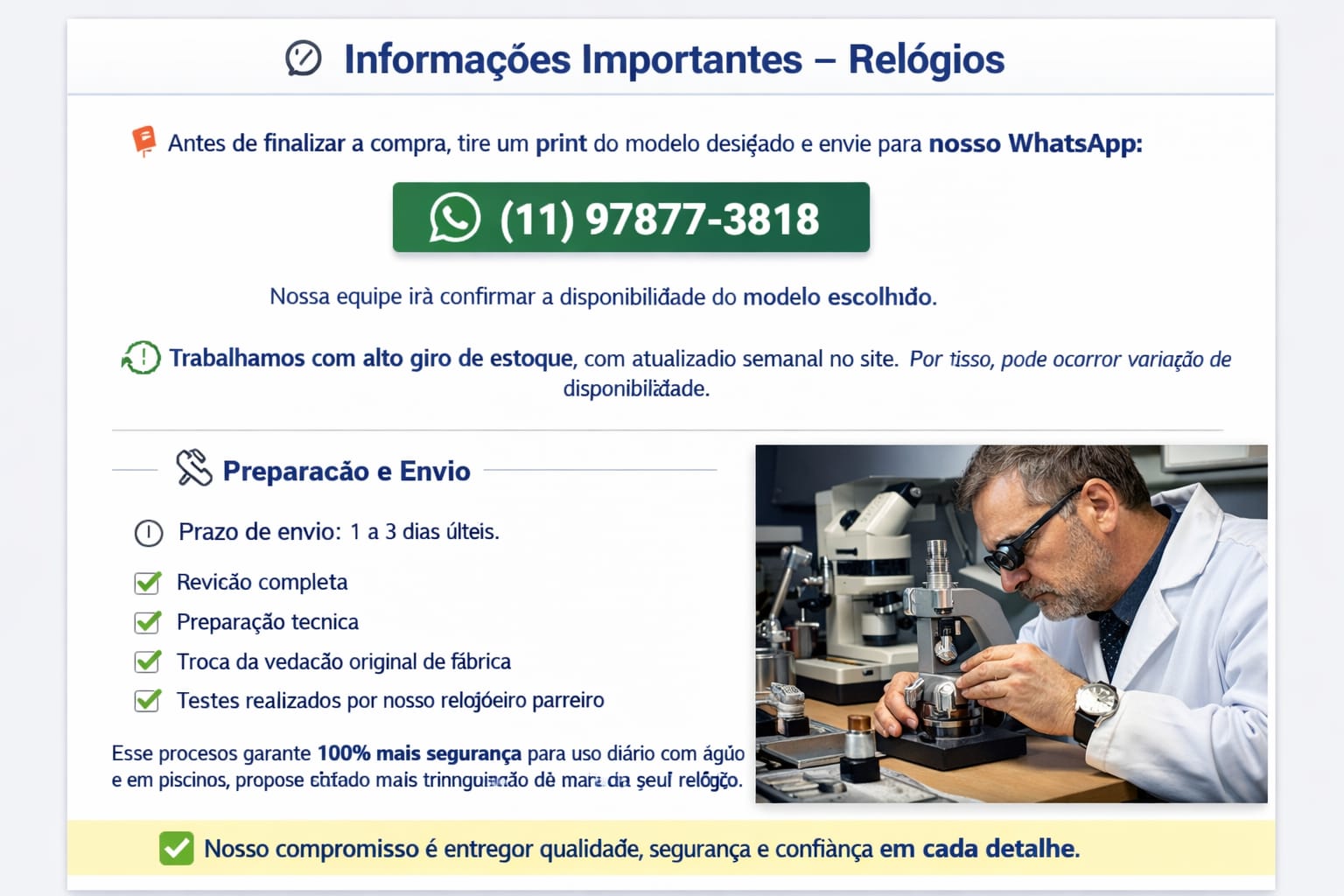 O relógio é enviado em caixa simples para transporte seguro. Caso deseje caixa original, consultar disponibilidade diretamente com nosso atendimento.